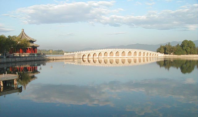 十七孔桥坐落在昆明湖上,位于东堤和南湖岛之间,用以连接堤岛,为园中最大石桥。石桥宽8米,长150米,由17个桥洞组成。石桥两边栏杆上雕有大小不同、形态各异的石狮500多只。