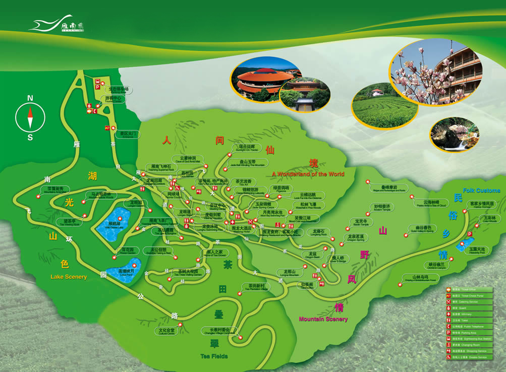主要景点和设施有茶田、果园、望茶亭、茶情阁、茶艺馆、美食街、生态谷、游泳池、网球场、人工湖、山水瀑布、游客中心、会议中心、围龙食府、山庄别墅、围龙大酒店、茶花大观园等。