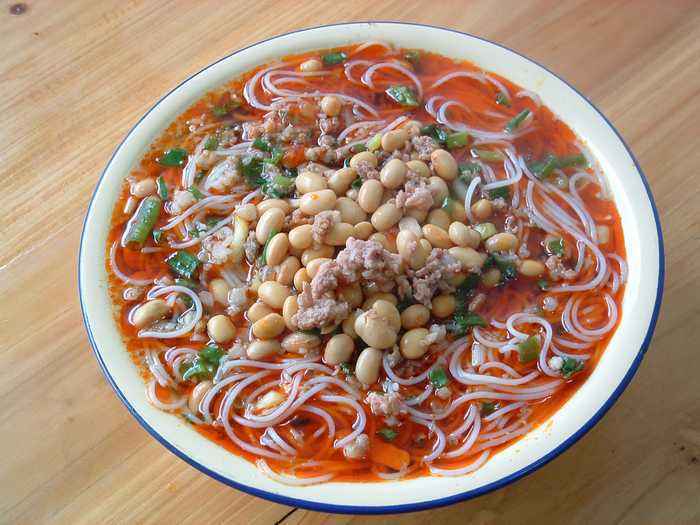 红油米粉 红油米粉是全州县的传统风味小吃之一,是本地人的早点,主要以:米粉、肉汤打底,红油浮面,绿葱点缀。