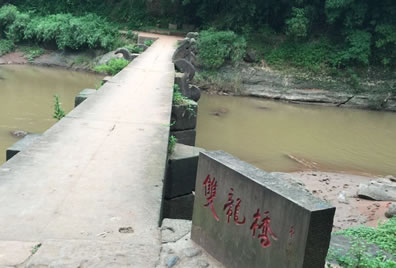 双龙桥位于丙安乡丙安村正安组一条河沟入赤水河的河口,始建于清代,面积约120平方米。双龙桥东西走向,桥长368米,宽1.7米,水面至桥面高3.2米,河中有九礅,礅宽3米,桥面分为九段,每段均为长4米,宽0.85米,厚0.5米的条石铺砌,中间两礅凿有一雌一雄两条龙昂首向上流方向,龙头高出桥面1.1米,桥中间另外三墩上有被破坏的雕刻痕迹,据附近居民讲是狮子造型,文革期间被打破丢弃河中,两端桥长14.4米,东端桥长3米。