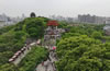 1957年建长江大桥武昌引桥时,占用了黄鹤楼旧址,如今重建的黄鹤楼在距旧址约1千米左右的蛇山峰岭上。楼共五层,高50.4米,攒尖顶,层层飞檐,四望如一。在主楼周围还建有胜象宝