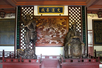 在这两尊神像的两边石柱牌匾上刻有曾国藩题写的对联:上联是“垂训意无穷,烁古炳今,总不外纲常名教”;下联是:“读书期有用,居仁由义,岂徒在科第文章”。从曾国藩的这幅对联可以看出,在当时历史环境下,不经过科举,士子们是不可能获得一官半职和有所作为的;而要获取功名,还得靠自己读书的刻苦和对纲常名教的执着。上方题有“文运昌盛”四字牌匾,预示着湖南人杰地灵,文运昌盛,更是人才辈出的地方。展示厅右边墙面青石板上刻有“历代湖南状元名录”,左边刻有“历代长沙进士名录”和“明清长沙府著名科举人才名录”,细心的游客朋友都会发现,湖南历朝历代金榜题名考中状元者只有15人,而考中进士之人达1300人以上,同时,位居显赫,大有作为之人均在进士之中!