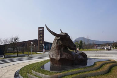 佛顶前苑,牛首山2018年全新景点,以10万方自然山水和小品景观展现了牛首山深邃的多元文化。佛顶前苑作为通向佛顶寺、佛顶宫的重要通道,设置了天阙揽胜文化景墙、集贤桥、十牛图塑石假山、心铭墙、法融广场、心莲广场、停心湖、趣牛园以及晚红小径等15处观景节点。整体通过三个层次的景致——前景“蜓戏红莲水映天”,中景“雾起白虹飘玉带”,远景“寺宇山色有无中” 构成一幅静谧秀丽的山林水墨画卷,尽显牛首山“隐秀”的环境气质。