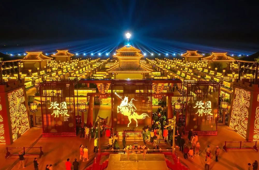 - 九曲黄河灯阵:占地150亩,全长2.4公里,按九宫八卦布局九大殿(关公殿、元始天尊殿等),设365杆旗、365盏灯对应全年天数,700余面文化墙融合二十四节气、十二生肖、二十八星宿等传统文化元素,夜间灯光秀与实景演艺《张国臂掖》结合,打造沉浸式汉唐市井体验。