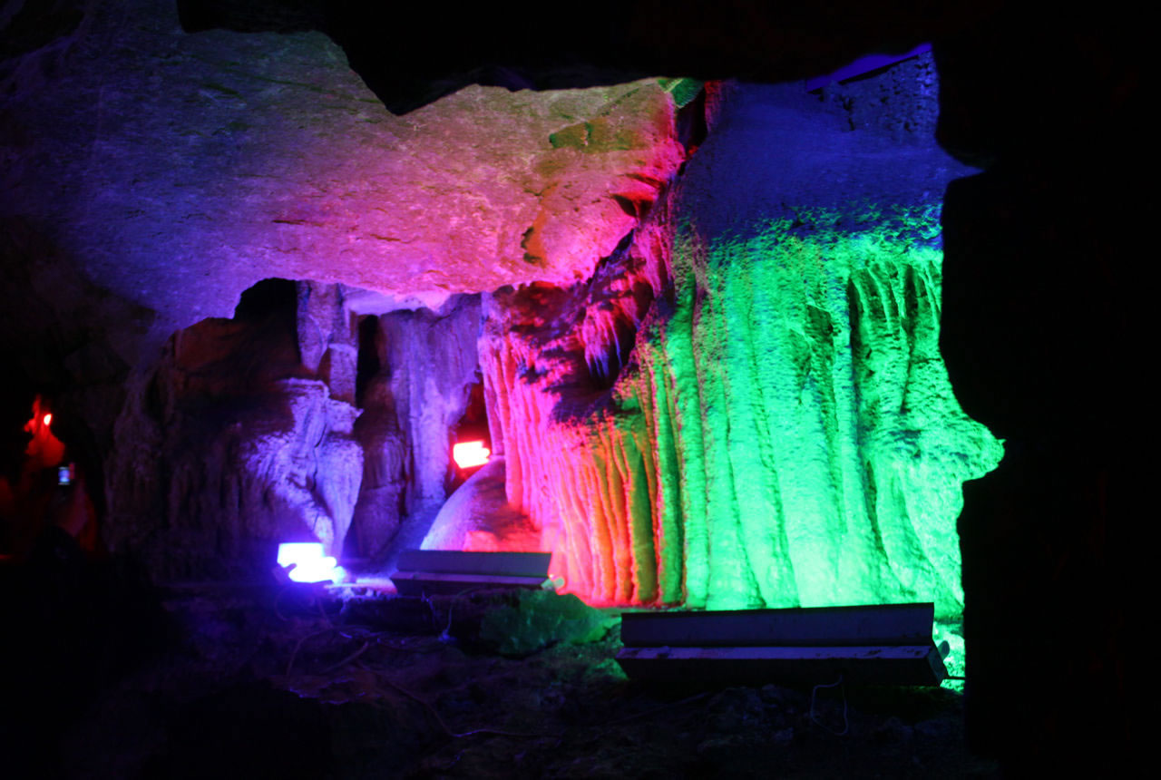 - 石钟乳群:洞顶垂挂的钟乳石与地面石笋形成“天地对望”景观,灯光映射下如梦似幻。