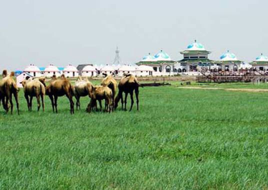 旅游区占地6000亩,总建筑面积为3260平方米,整体设计突出民族特色;五个殿堂式迎宾包,坐落在1.3米高的平台上,气势磅礴,造型典雅,富丽堂皇,两侧是18个豪华型固定包和14个传统毡包,组成蒙古包群。建筑的正南面是周长为1000米的赛马场,通辽市一年一度的赛马节就在这里举行。