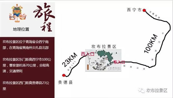 贵德县距离坎布拉景区西入口23公里,该路段道路通畅,大小车均可到达,高2.8米及以下车辆可从阿什贡黄河大桥至坎布拉景区西入口,2.8米以上大车可沿江苏大道至坎布拉景区西入口。