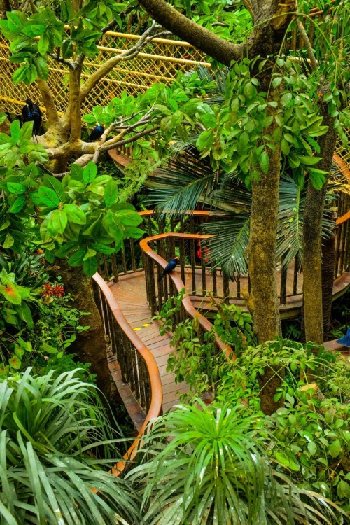 正佳雨林生态植物园场馆面积约15000平方米。园内以独特的生态设计理念,展现了一个具有生物多样性的“自然生态圈”——这里有800多种动植物,涵盖昆虫、两栖、爬行、鸟类等动物和猴面包树、疣柄魔芋、见血封喉等珍奇植物。在这里,不仅可以展开一场奇趣的植物探秘,还能从天空步道360°俯瞰整个园区、感受15米空中瀑布飞流直下的刺激。