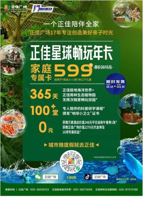 据了解,正佳星球畅玩卡在“玩、学、吃、购”四大方面下足功夫,其核心权益包括:365天无限次畅玩正佳极地海洋世界、正佳雨林生态植物园,超过100堂专属科普研学课程免费参加;五星级万豪酒店自助午餐免费体验,还有哇哇哇游乐城、众多潮玩项目体验,同时额外赠送价值2276元代金券及16项专属权益的“正佳广场吃喝玩乐学”大礼包。这张卡仅售599元,适用于1名成人使用,同时持卡人可以可携带2名1m(不含)以下儿童游览正佳极地海洋世界、正佳雨林生态植物园,携带1名1.2m(不含)以下儿童至万豪酒店免费用餐。除了599的卡,正佳还根据不同家庭的出游习惯,贴心地推出了899、1199、1499等不同价位的产品,覆盖从一大一小到二大一老一小不同家庭出游人群,最大限度为市民省钱。