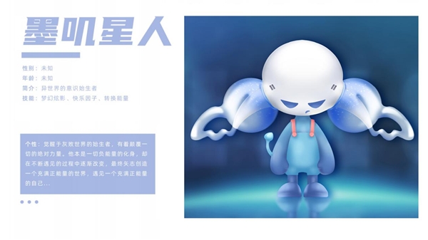 作为异世界的意识始生者,“墨叽星人”拥有“快乐因子”、“转换能量”、“梦幻炫影”三个核心技能。它原本是一切负能量的化身,却在不断遇见的过程中逐渐改变,为遇见一个被温暖和爱环绕的自己,“墨叽星人”走上了探索与发现的旅程,最终立志创造一个充满正能量的世界……