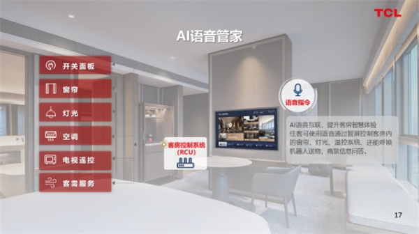 在TCL方案中,TCL在酒店客房标配TV的硬件基础上,创新引入语音交互系统,仅需要通过1台电视,与客房RCU的打通,贴心的“AI语音客房管家”在住客的语音唤醒指令下,能以声音和电视画面的视听双重交互方式,实现酒店客房全场景的控制和反馈,一台电视满足所有功能。