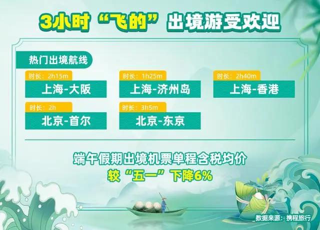 数据显示,端午假期出境游预订同比增长超12倍。出境旅行成本正在降低,目前携程平台上,端午假期出境单程机票含税均价比“五一”期间价格降低约6%。多条飞行时长在3小时内的航线受到欢迎,如上海-大阪、上海-济州岛、上海-香港、北京-首尔、北京-东京等,最短飞行时长不足1个半小时,最长也仅有3小时5分钟。
