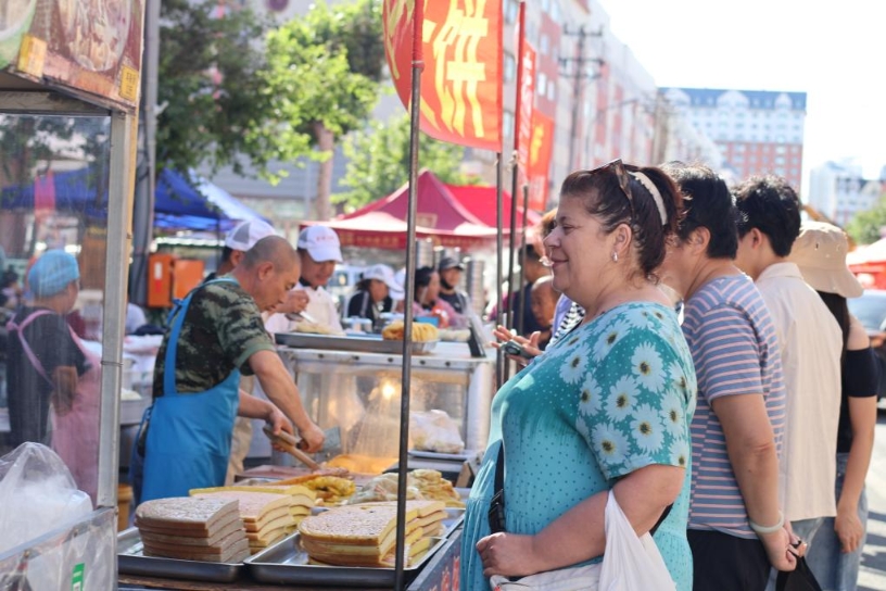 这是俄罗斯游客黑河早市选购早餐(7月8日摄)。新华社 记者 姜思妮 摄