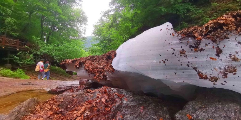 景区工作人员介绍,大冰沟森林公园地处中温带低海拔地区,属峡谷地貌,冬天山泉冻结成厚厚的冰盖,第二年8月才会完全消融,形成了夏季“冰瀑”奇观。游客行走在森林公园中,不禁为“左手盛夏右手冬”的奇妙体验折服。