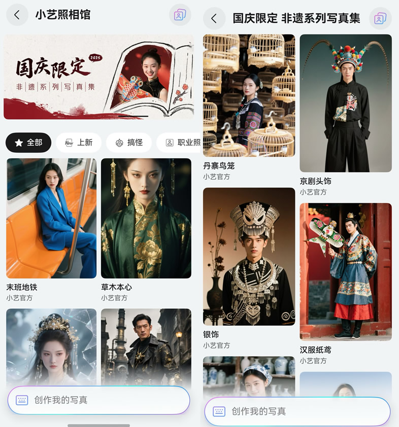另外,对于想拍文化感满满的国风影像的用户,小艺照相馆Agent上线了国庆限定非遗系列模板,进入小艺App>右下角发现>智能体>小艺照相馆后,在国庆限定专区选择喜欢的模板,然后就可按步骤生成高质量的国风写真,打造专属非遗系列写真纪念册。