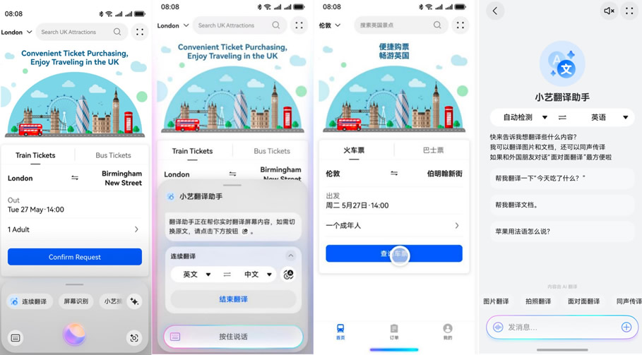 当然,小艺的能力远不止于此。海外出行时,用户翻阅外文网站或使用外文App,只需长按屏幕底部小艺导航条,点击“连续翻译”,或直接唤醒小艺后说“连续翻译”,即可体验边浏览边翻译的效果。当需要与外国友人进行面对面沟通时,使用小艺的面对面翻译帮你轻松应对跨语言沟通场景;遇见不认识的外文路牌、菜单,拍照发给小艺翻译助手秒翻译。