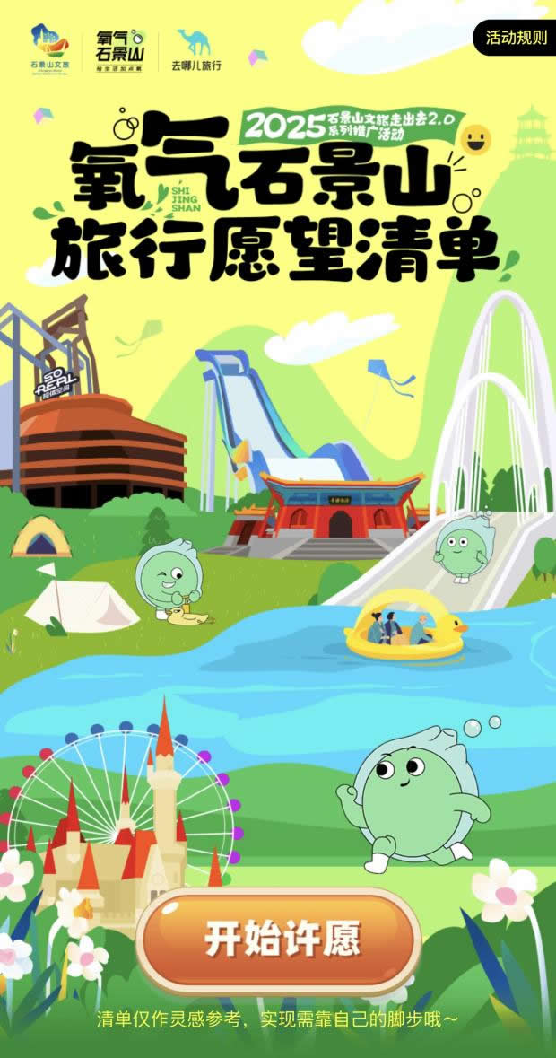 在“去哪儿”旅行APP上线“氧气石景山”文旅专题页,不仅整合酒店榜单、景区门票、优质攻略等核心文旅资源,更特别设置石景山区对口支援和协作地文旅产品版块,实现“石景山推广+支援地区助销”双重价值。同步推出的“旅行打卡愿望清单”H5,线上用户可点亮自己的石景山旅游心愿,生成专属旅行愿望清单;在高校路演活动中,大学生可分享H5到社交媒体作为参与活动的入场券——既为高校活动预热,更成为高校路演入场凭证,串联起“线上互动-线下参与”的闭环。