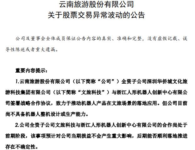 根据云南旅游22日盘后发布的异动公告,目前,双方合作尚处于前期阶段,该事项预计对公司当期损益不会产生重大影响,后期能否顺利落地推进存在不确定性。另外,公司目前尚不具备机器人整机设计或生产能力。