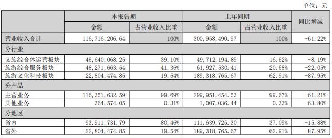 财报显示,最近几年,公司文旅科技板块的营收占比均在50%以上,是公司的主要驱动力,然而今年上半年,公司文旅科技板块营收仅有2280.45万元,占比19.54%,缩水严重。