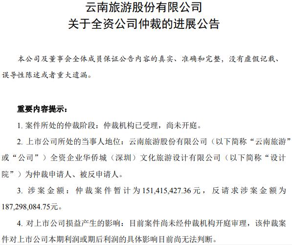 公司在今年2月发布公告,海力控股集团有限公司与公司的全资公司云南旅游汽车有限公司所属全资公司云南云旅交通投资开发有限公司发生合同履行纠纷,海力控股就该合同纠纷向昆明市中级人民法院提起诉讼。因云旅交投认为海力控股存在违约,对案件提起反诉。近日,公司收到昆明中院出具的《民事判决书》,判决由云南云旅交通投资开发有限公司支付海力控股集团有限公司工程款1.18亿元及预期利息等。