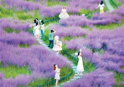 广西壮族自治区南宁园博园景区,粉黛乱子草盛情绽放,吸引了许多游客前来打卡拍照。