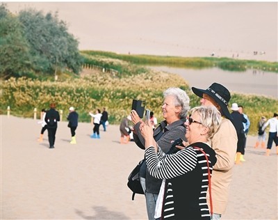 外国游客在甘肃省鸣沙山月牙泉景区游览拍照。