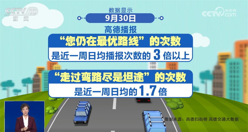 我们再来看一个有趣的数据。“虽然前方拥堵,但您仍在最优路线上”“今天走过了所有弯路,从此人生尽是坦途”,高德导航的“劝堵”金句与长假出行实时相伴。数据显示,9月30日,高德播报“您仍在最优路线”的次数是近一周日均播报次数的3倍以上,播报“走过弯路尽是坦途”的次数是近一周日均的1.7倍,可见自驾出行的人越来越多。不过,也有重庆网友表示“扎心”,“走过弯路还是弯路,坦途这句等我开出重庆再说。”