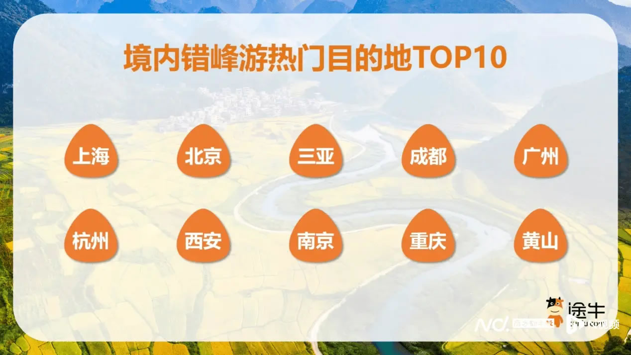 境内错峰游仍是多数游客的首选,途牛平台上境内出游人次占比超过70%。热门目的地包括上海、北京、三亚、成都、广州、杭州、西安、南京、重庆、黄山等地。