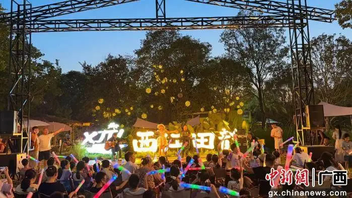 西江田韵休闲营地的草坪音乐会人气爆棚。每日傍晚,草坪上坐满游客,主办方邀请多风格乐队、歌手现场演出,动感流行曲与舒缓民谣交替响起,旋律在田野间回荡。游客或铺野餐垫围坐,或站在草坪边缘挥舞荧光棒,随节奏轻摇,享受独特音乐盛宴。
