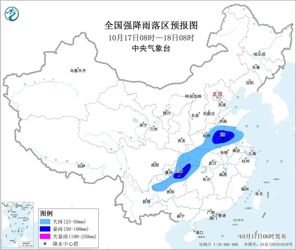 预计,10月17日8时至18日8时,重庆东部和北部、湖北中西部、河南中东部、山东南部、安徽北部、江苏北部、湖南西北部、贵州西部和北部等地部分地区有大到暴雨,其中,重庆东南部、贵州东北部等地局地有大暴雨(100~120毫米)。上述部分地区伴有短时强降水(最大小时降雨量20~40毫米,局地可超过50毫米),局地有雷暴大风等强对流天气。