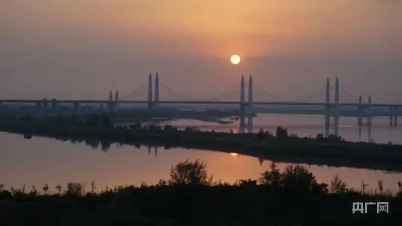 黄河湿地公园畔,落日与长桥在水面绘就绝美画卷(央广网发 杨佳 摄)