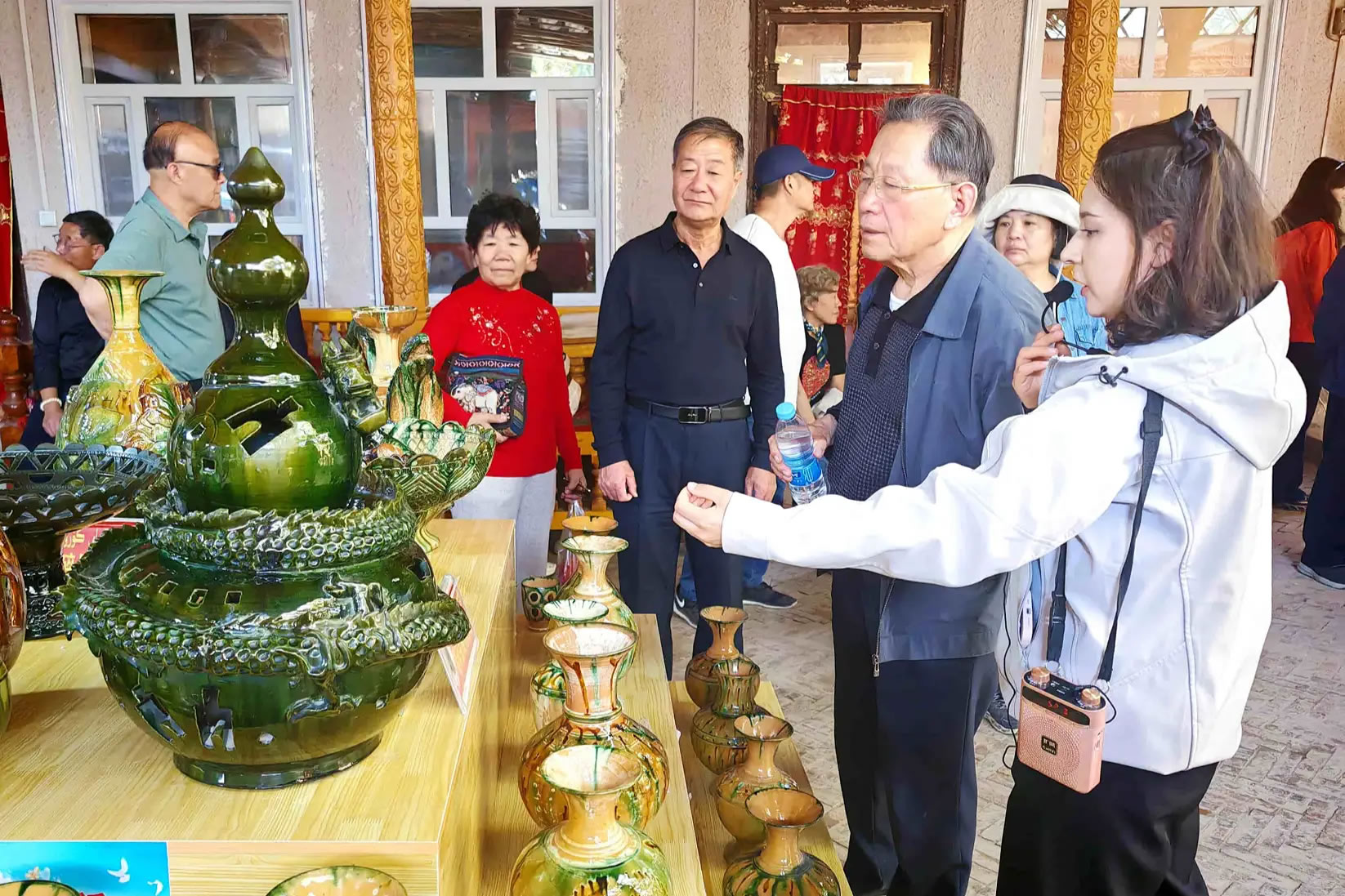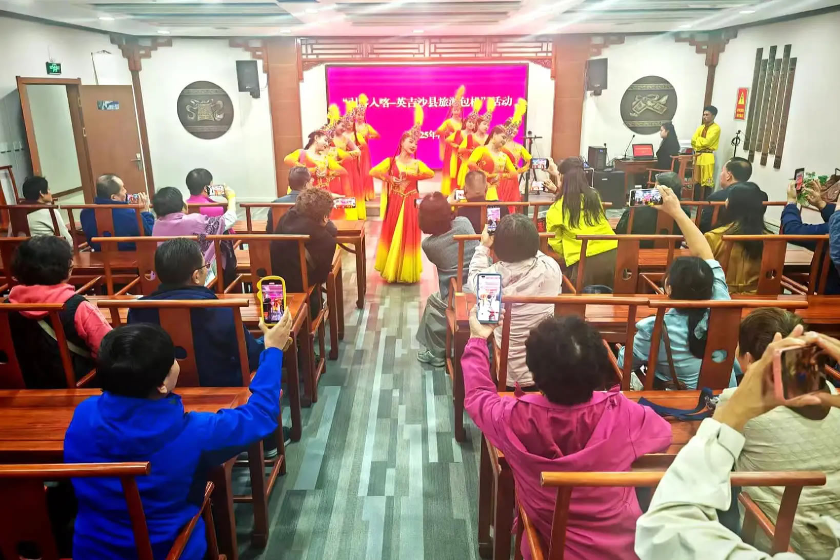 在英吉沙县国学书院举行的欢迎仪式上,县文工团的演员们载歌载舞欢迎远道而来的客人,游客与演员们热情互动,共同起舞,在欢快的舞步和热烈的氛围中拉近距离、增进了解。随后,大家参观了县国学书院,体验国家级非物质文化遗产——模戳印花布制作工艺,感受传统文化的魅力。