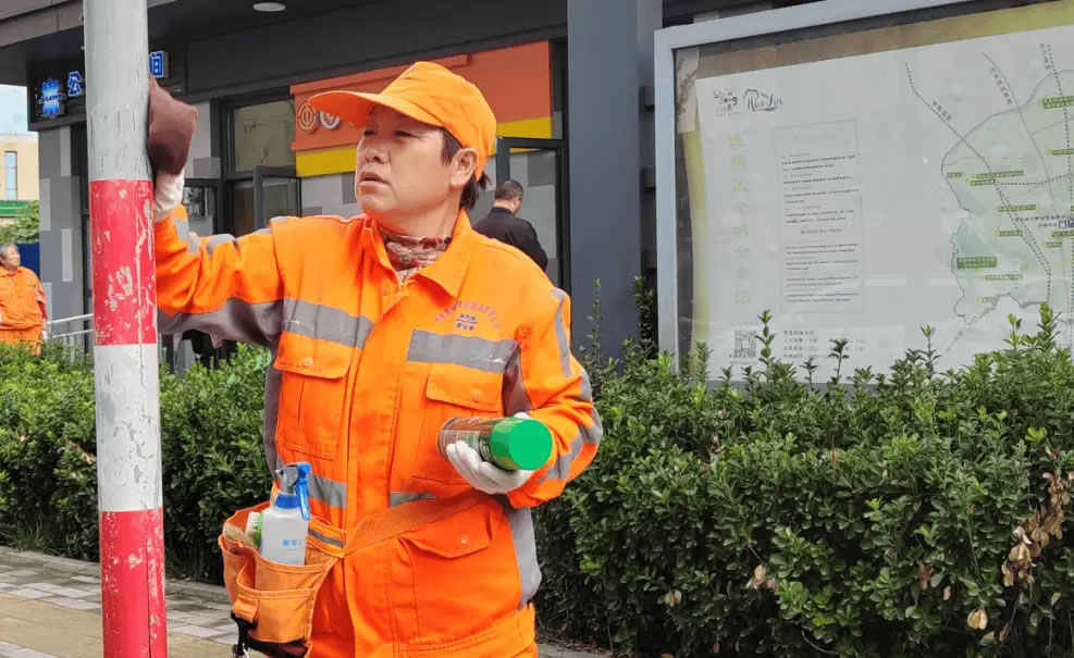在槐荫区,环卫工人马增霞随身携带“八宝袋”,对齐州路沿线的垃圾桶、路灯杆、公交站牌等进行清扫。“这个‘八宝袋’里有软毛刷、硬毛刷、除胶剂、手套、喷壶等8种工具。”马增霞介绍,“八宝袋”轻便易携且取用便捷,可实现“一包在手,百污可除”,有效提升了主次干道人行道、交通出入口等重点区域的动态巡查处置效率;夹层内的清凉油、创可贴、速效救心丸,既为保洁人员提供安全防护,也能满足市民应急需求。