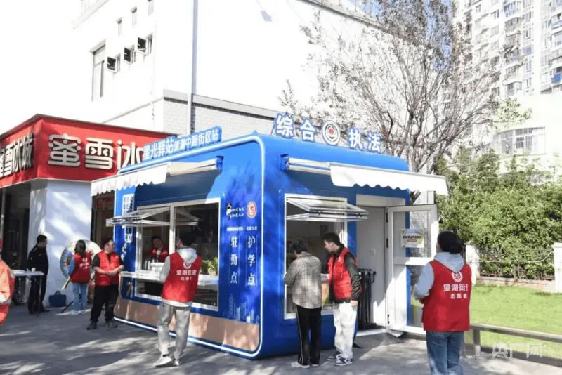 作为街区重要的“便民枢纽”,星光驿站功能定位清晰明确:面向户外劳动者,这里是一座“能量补给站”,免费提供饮水、热饭、充电等基础服务,驱散奔忙的疲惫;对于周边居民,它是一处“暖心港湾”,常态化开展义诊、义剪等志愿服务,让便利直达身边;针对沿街商户,驿站则是一个“助力平台”,及时更新政策手册、提供证照办理咨询,助力经营发展。