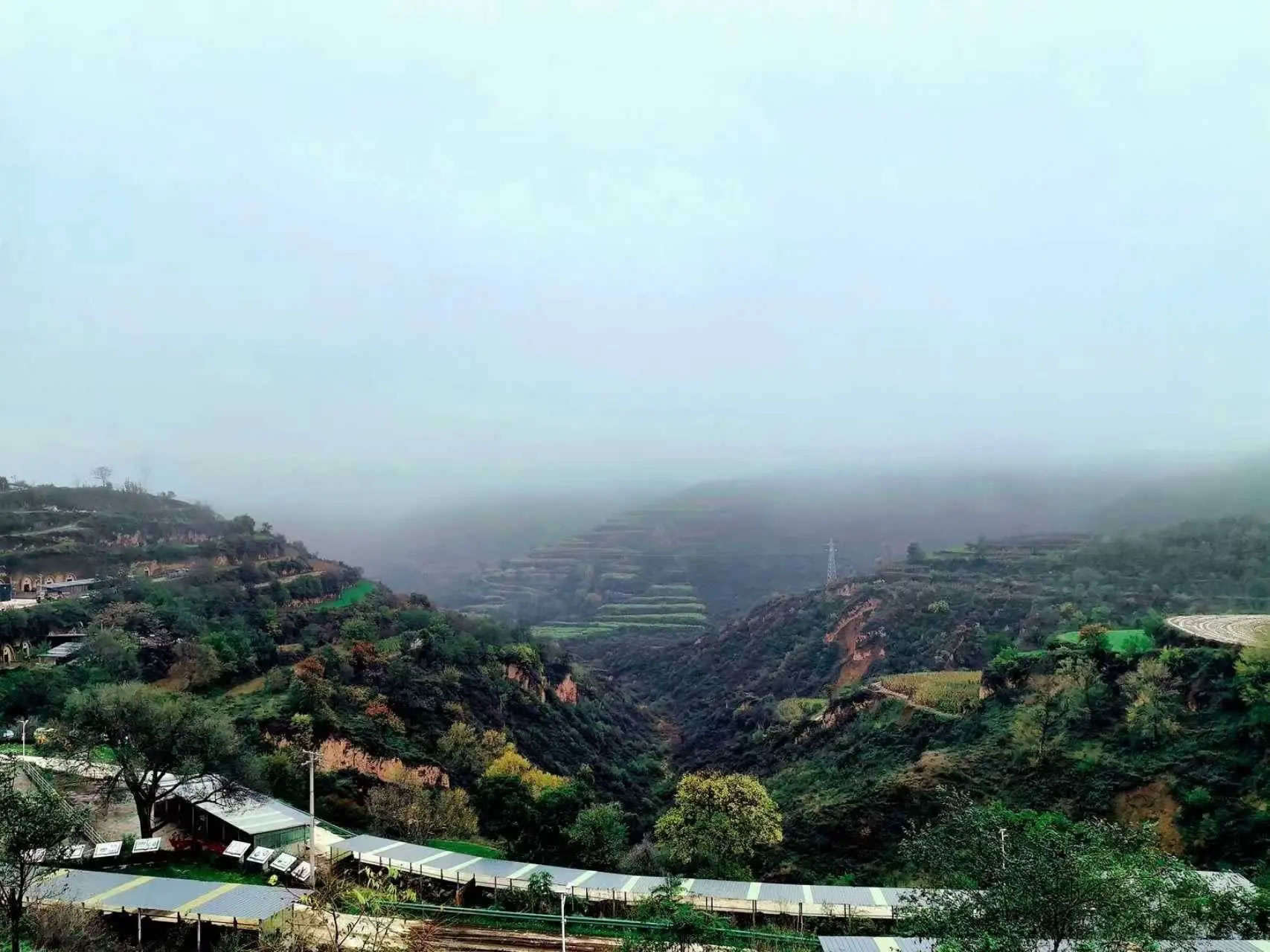 大寨乡海拔1540米、北纬35.38度,属温带半干旱气候,四季分明、风景宜人,丰富的水资源和广袤的植被共同构筑了独特的局部小气候,使得大寨乡在降雨之后,常常云雾缭绕。如纱的雾气萦绕于山峦沟壑之间,将远山近树渲染成一幅流动的水墨画。