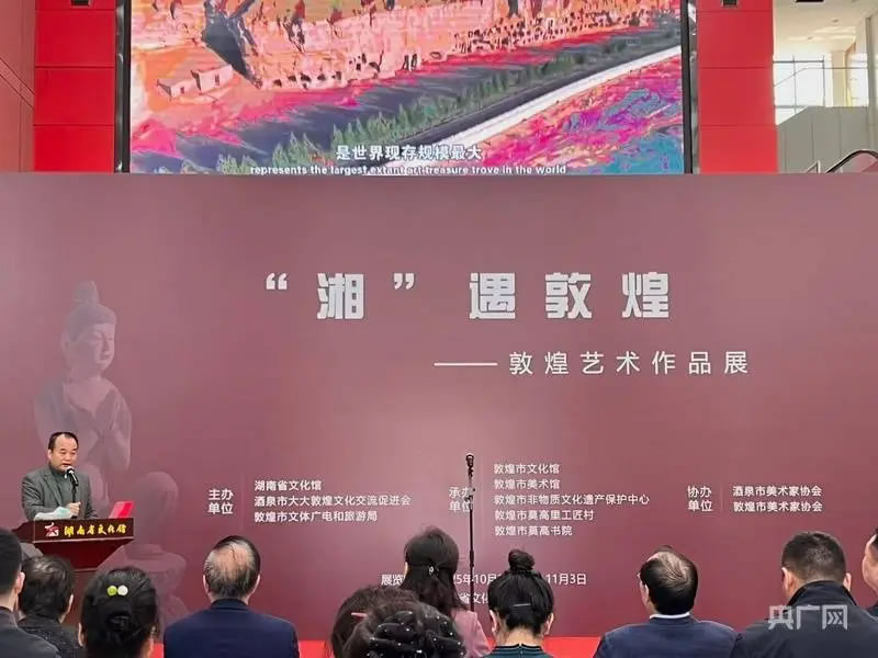 央广网长沙10月28日消息(记者 黄珂岚 实习记者 蒋好)10月28日上午,一场跨越千山万水、连接千年文明的文化盛宴“湘”遇敦煌——敦煌艺术作品展,在湖南省文化馆盛大开幕。此次展览不仅是敦煌文化与湖湘文化的一次深度对话,更为两地文化交流互鉴构建新桥梁。据悉,展览将持续至11月3日结束。