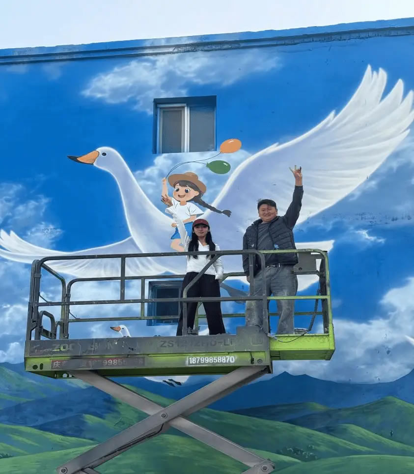 10月25日,新疆库尔勒市杜鹃河畔天鹅驿站旁,一幅高15米、宽13米的天鹅主题彩绘正式完成创作。墙绘师雷雪带领团队耗时十几天匠心打磨,将蓝天白云、河流高山与灵动天鹅的景致定格在墙体之上,为这座城市的“生态名片”再添艺术亮色。