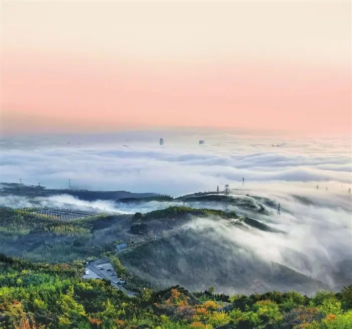 清晨6时许,市民高劲鹏与朋友驱车前往西山万亩生态园。沿途雾气弥漫,山路蜿蜒间,红黄绿相间的植被频频跃入眼帘,偶有灵动的松鼠从山路旁蹿出又疾速消失在马路对面,远处山峦影影绰绰,“人在画中游”的韵味十足。汽车快抵达山顶时,眼前的浓雾突然消散,淡蓝色天空下,云海如流水般在城市上空铺开。远处,云层翻涌似海浪;近处,沿山雾带若玉带流动,高压电线塔顶端与零星高楼在雾中时隐时现。