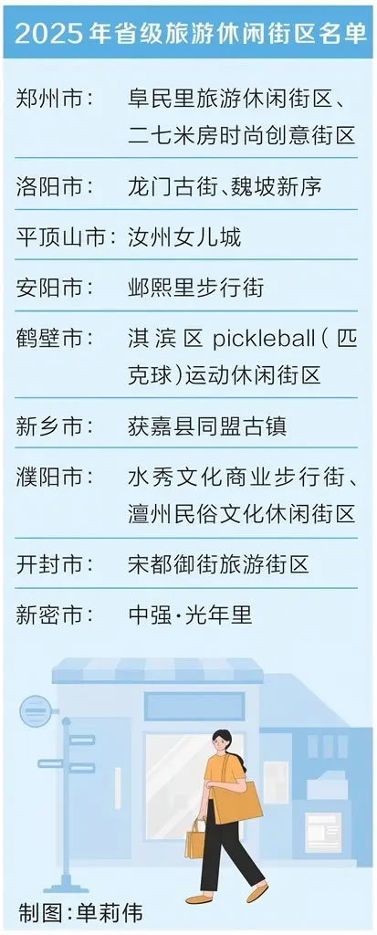 11月14日,河南省发展改革委根据《旅游休闲街区等级划分》国家行业标准(LB/T082-2021)和《河南省省级旅游休闲街区评定细则(试行)》,认定郑州阜民里旅游休闲街区、洛阳龙门古街、安阳邺熙里步行街等12家休闲街区为2025年河南省省级旅游休闲街区。