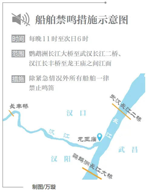根据《湖北省长江船舶污染防治条例》的相关规定,武汉海事局、武汉市交通运输综合执法支队联合发布《关于实施船舶噪声管控的通告》,要求在限定区域和时段的船舶应通过“采取有效措施控制主辅机噪声”“关闭舱门或加装消声器”等形式主动降噪,最大限度降低运行噪声。港口作业或者水域施工也需有效控制噪声,确保达标。
