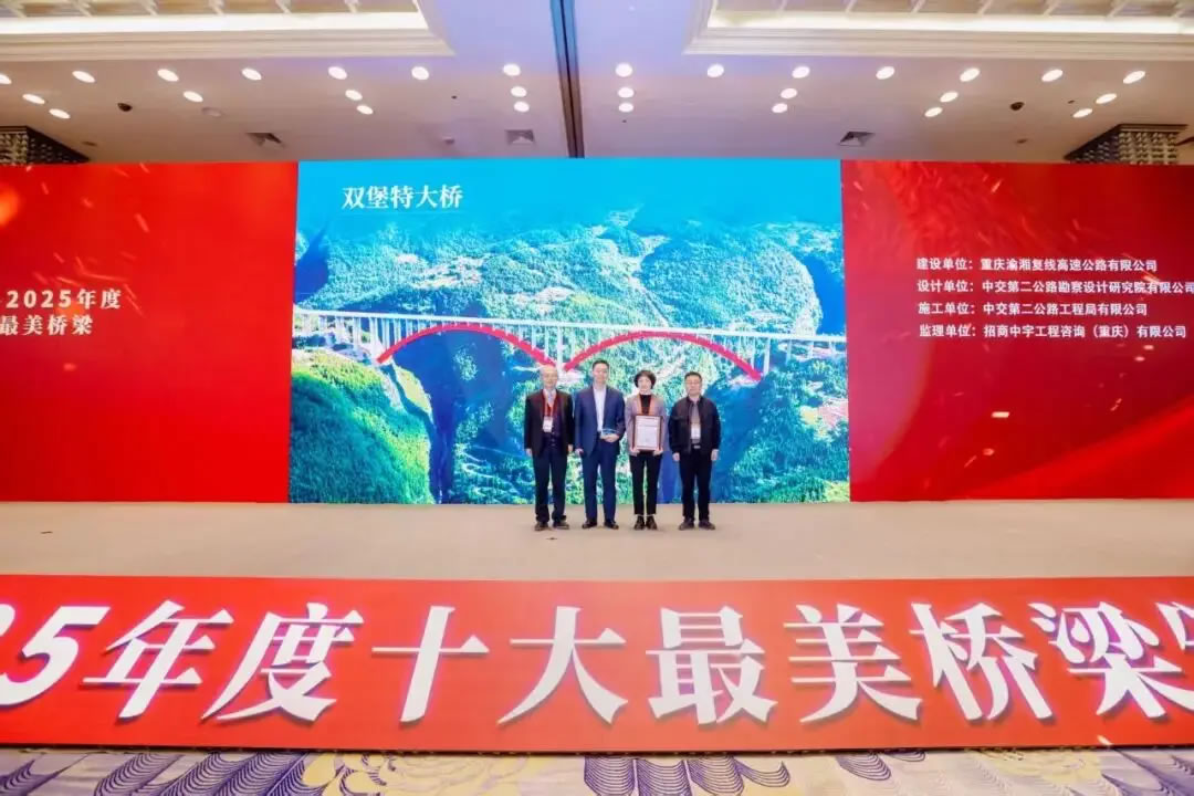 近日,由《桥梁》杂志社组织举办的“2020-2025年度十大最美桥梁”终评会议及颁奖晚会举行,其中,渝湘复线高速公路双堡特大桥获评“2020-2025年度十大最美桥梁”。