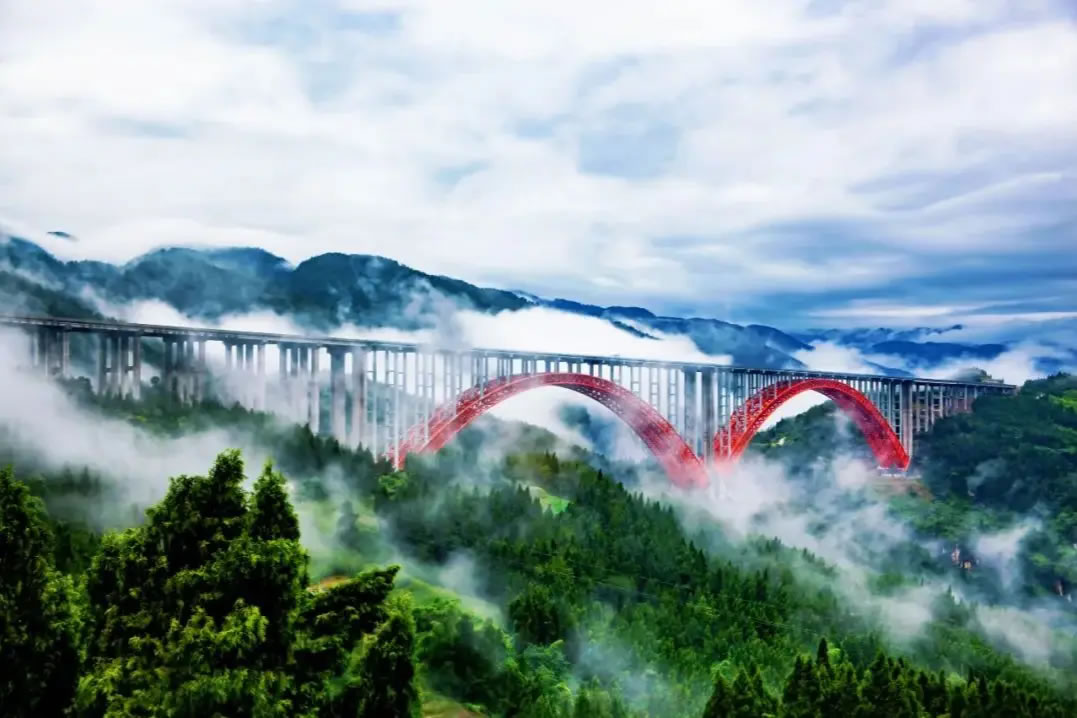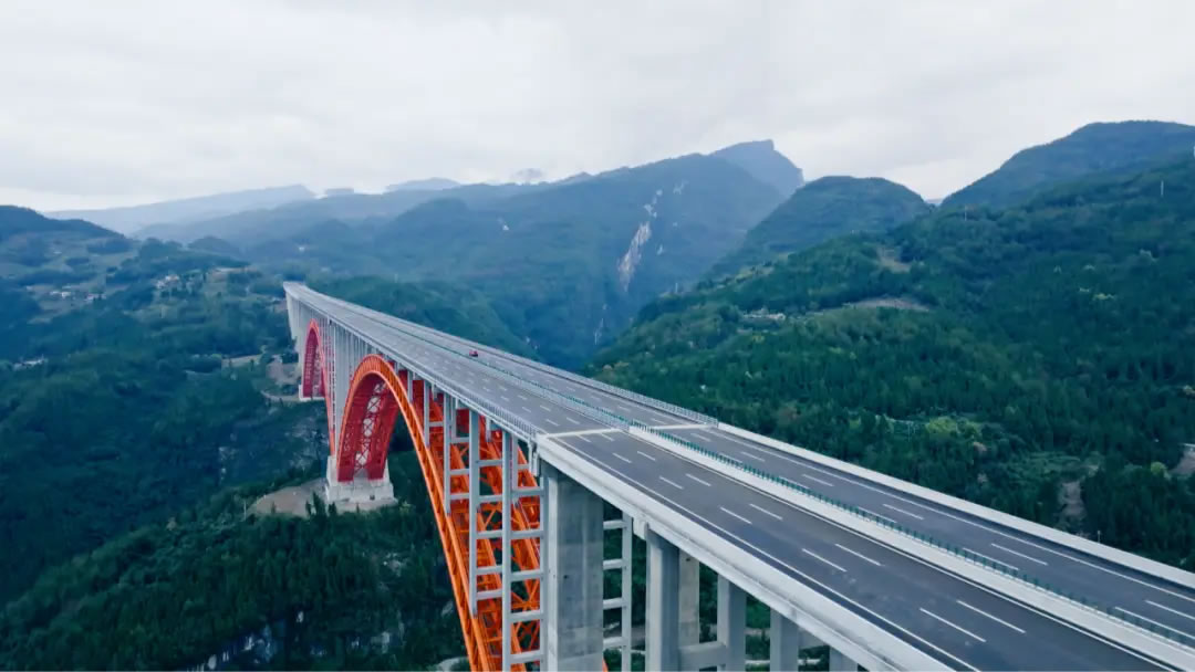 山涧云兴霞蔚,双虹飞跨天险。橙红拱如晨曦晕染,勾勒群山力量曲线;简洁的四肢钢管,书写出结构美学的动人诗篇。索道飞越,是工程与自然的和谐共舞;桩基深植,是技术与地质的真诚对话。双堡特大桥连接山与山,更连接人与自然。