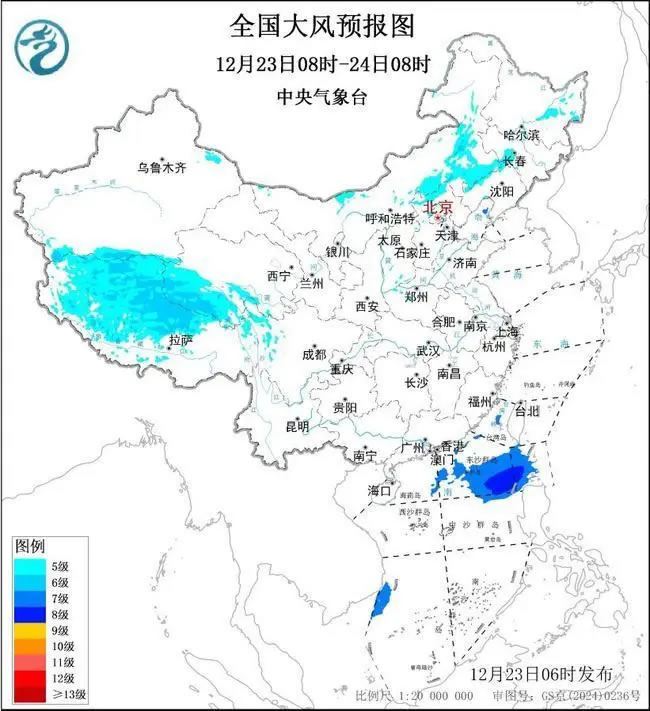 预计,12月23日08时至24日8时,内蒙古中东部、华北北部、黑龙江中东部、吉林西部、辽宁北部及辽东半岛、新疆北疆东部及南疆盆地山区、青海南部、西藏中北部等地有5~6级风,阵风7~8级;巴士海峡、南海东北部将有7~8级、阵风9级的大风,渤海东北部局地海域将有7级、阵风8级的大风。