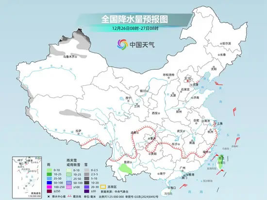 昨天开始,全国的降水开始逐渐减少。昨天,东北地区的降雪基本结束,南方仍有大范围阴雨。监测显示,24日8时至25日6时,新疆北部、内蒙古东部、东北地区及山东半岛等地部分地区出现雨夹雪或小雪;广西北部至浙江北部一带等地部分地区出现中雨或大雨。