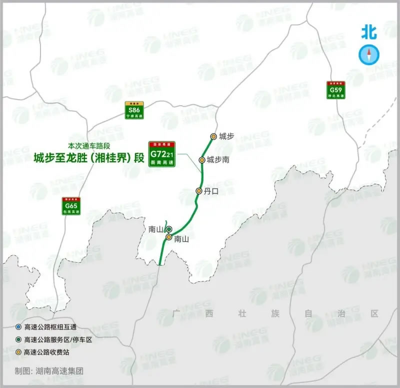 G7221衡南高速城步至龙胜(湘桂界)段北起邵阳市城步苗族自治县儒林镇,顺接已建的武冈至靖州高速公路城步支线,途经塔溪、泮水、粗水等地,止于湘桂交界处的五团镇双田。主线里程51.790公里,共设互通4处,收费站3座,服务区1处,最高限速120公里/小时,项目全线桥梁57座,隧道8座,桥隧比高达57.3%,同步建设南山互通连接线7.088公里。项目建成通车后,湘桂两省将再添一条省际通道,极大改善区域交通运输条件,成为湖南融入西部陆海新通道的重要节点,对推进乡村振兴、促进区域资源开发和经济社会协同发展具有重要意义。