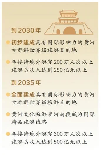 《规划》设定的双阶段目标,为黄河古都群的发展锚定了清晰航向。到2030年,初步建成具有国际影响力的黄河古都群世界级旅游目的地,年接待境外游客200万人次以上,旅游总收入达到250亿元以上;到2035年,全面建成具有国际影响力的黄河古都群世界级旅游目的地,黄河文化旅游带河南段成为国际精品旅游线路,年接待境外游客300万人次以上,旅游总收入达到500亿元以上。