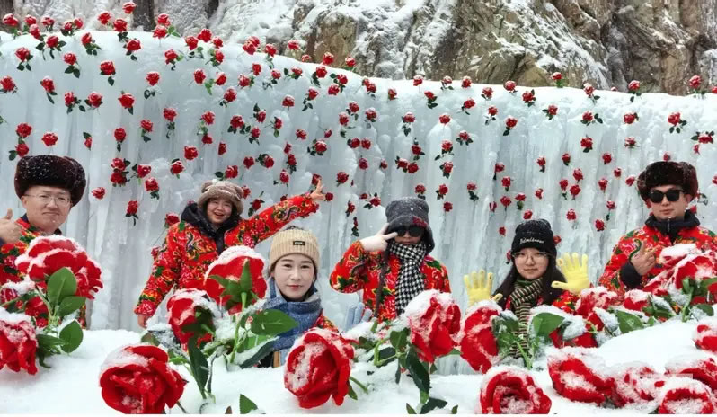 冰封的玫瑰、融入岩画元素的雪雕、百米长的雪圈滑道,将景区打造成梦幻的冰雪秘境。身着多彩冬装的游客们穿梭其间,或驻足观赏或拍照打卡,不时发出阵阵赞叹。“岩画和冰雪结合,就像穿越到了冰河时代!”来自西安的游客李女士,一边拍摄冰封玫瑰,一边向同伴分享自己的感受。