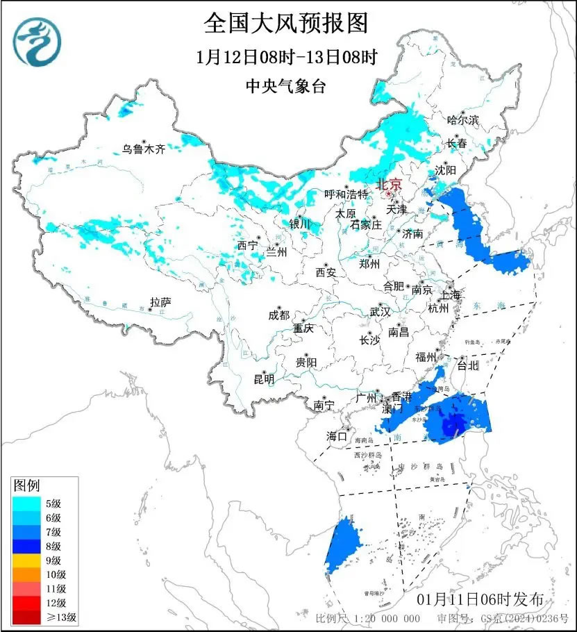 预计,1月11日08时至12日08时,内蒙古中西部、甘肃西部、宁夏北部、华北北部、山东半岛、辽东半岛、西藏中北部等地部分地区有5~7级大风、阵风8~10级;渤海、渤海海峡、黄海大部海域、东海大部海域、台湾海峡、巴士海峡、南海大部海域将有7~8级、阵风9级的风,其中,台湾海峡、巴士海峡、南海东北部的部分海域将有9级、阵风10级的大风。