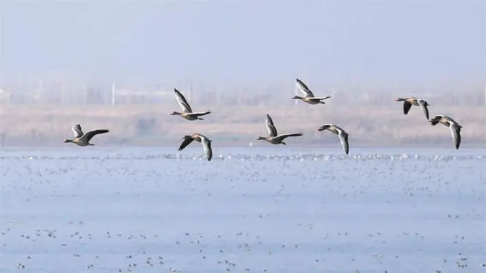 在沉湖湿地自由飞行的灰雁小分队 通讯员颜军摄