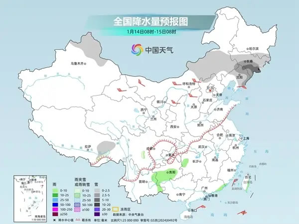 明天,内蒙古中部、黑龙江南部、吉林、辽宁中东部、新疆北部、西藏东北部、河北北部等地部分地区有小雪或雨夹雪,其中,吉林中南部、辽宁北部和东部等地部分地区有中到大雪,吉林东部局地有暴雪。湖南西部、贵州中南部、云南东部、广东东南部沿海、台湾岛东部等地部分地区有小雨。